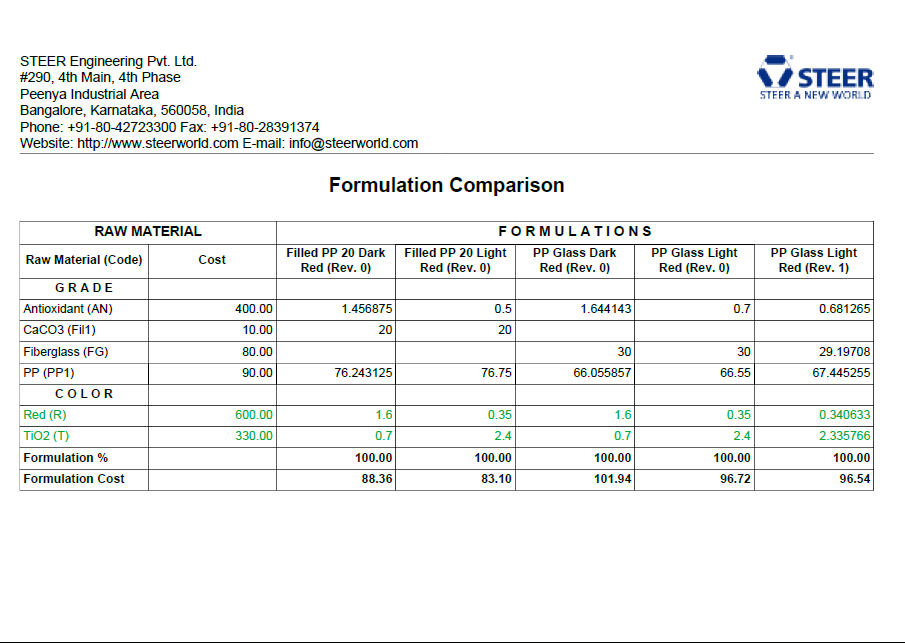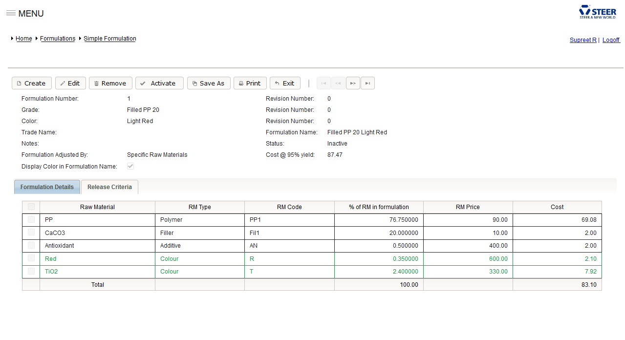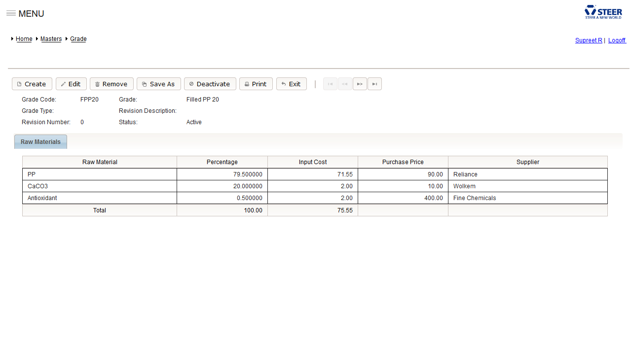Raw material properties, their cost and supplier details are recorded and maintained within PRODUCTLINE. PRODUCTLINE provides the ability to replace a raw material with another across grades, colors and formulations.