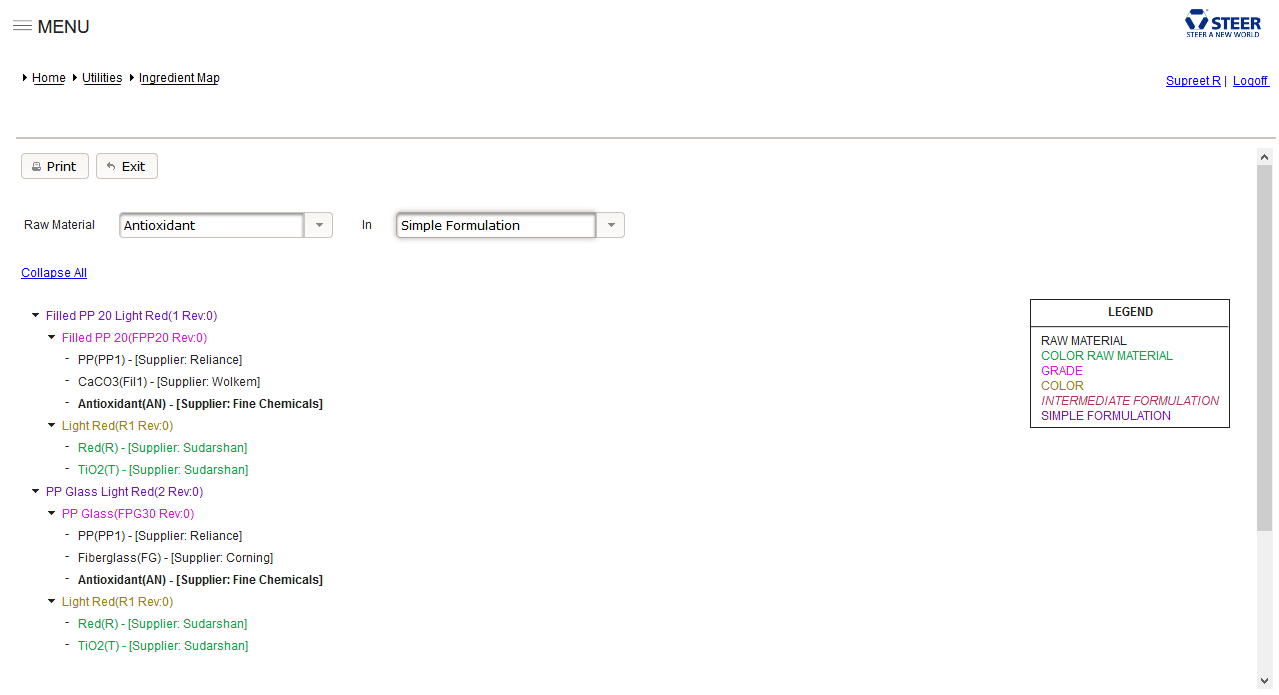 PRODUCTLINE's process specification sheet consolidates all of the information needed to manufacture a formulation into a single report. This comprehensive report helps streamline the formulation manufacture process. The formulation tree feature decomposes a formulation into its constituents and provides an expanded hierarchical tree view of the formulation. Ingredient map displays the grades and formulations that use a particular raw material providing at a glance visualization of raw material usage across grades and formulations